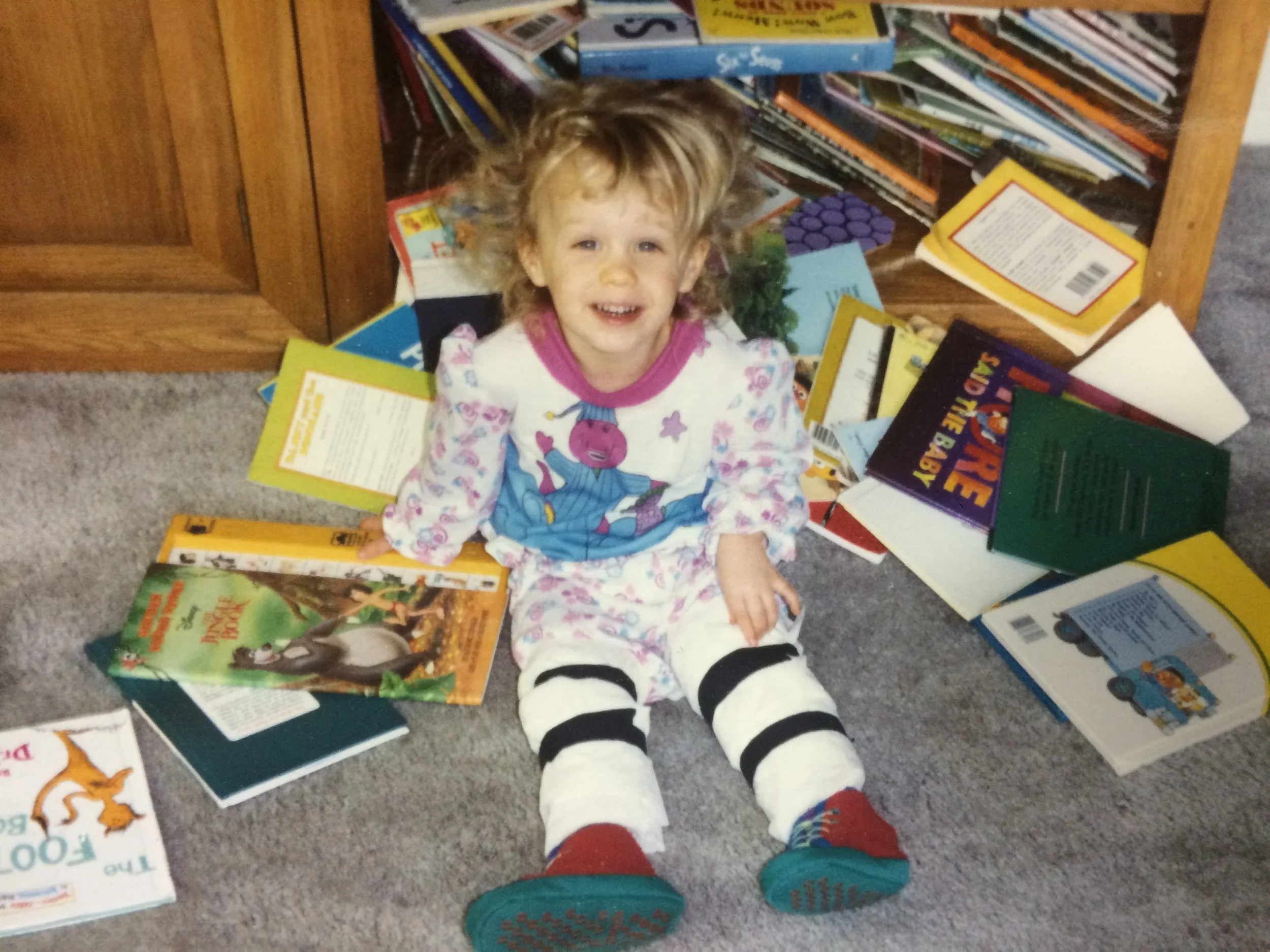 (Below: One of my first roles, portraying a woman suffering from two broken legs byway of a book avalanche.)